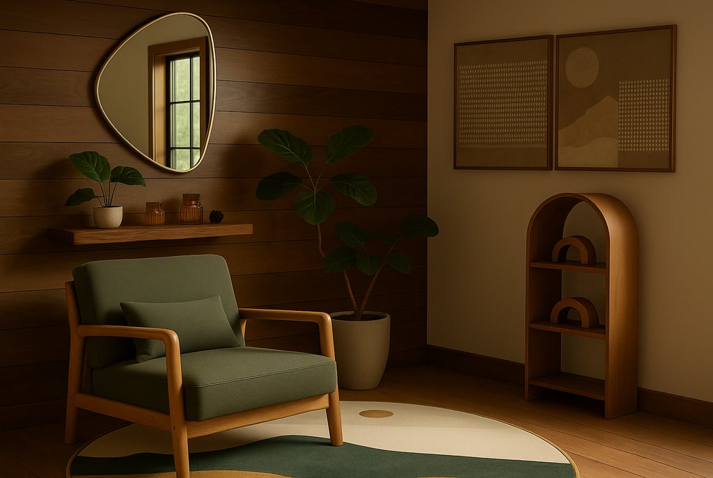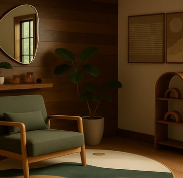This serene sitting nook blends mid-century lines with warm wood tones, featuring a green armchair, abstract mountain rug, live-edge shelf, and sculptural accents—perfectly capturing the modern mountain aesthetic.