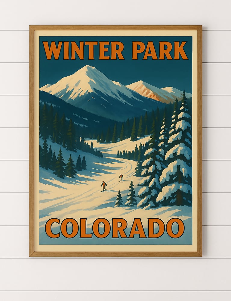 A bold tribute to Keystone’s adventurous spirit, this poster features a retro ski scene with bold color and movement.Winter Park Vintage Poster