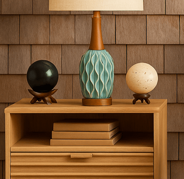The VFDOM Travertine Sphere sits like a sculptural relic—rough, porous, and naturally patterned with organic variation. Its texture contrasts beautifully with the smooth, dark surface of the Authentic Shungite Stone Sphere, which gleams like obsidian and carries with it centuries of use in holistic traditions. These spheres aren’t just decor—they’re material poetry, a study in contrasts that grounds the space with their shape and substance.