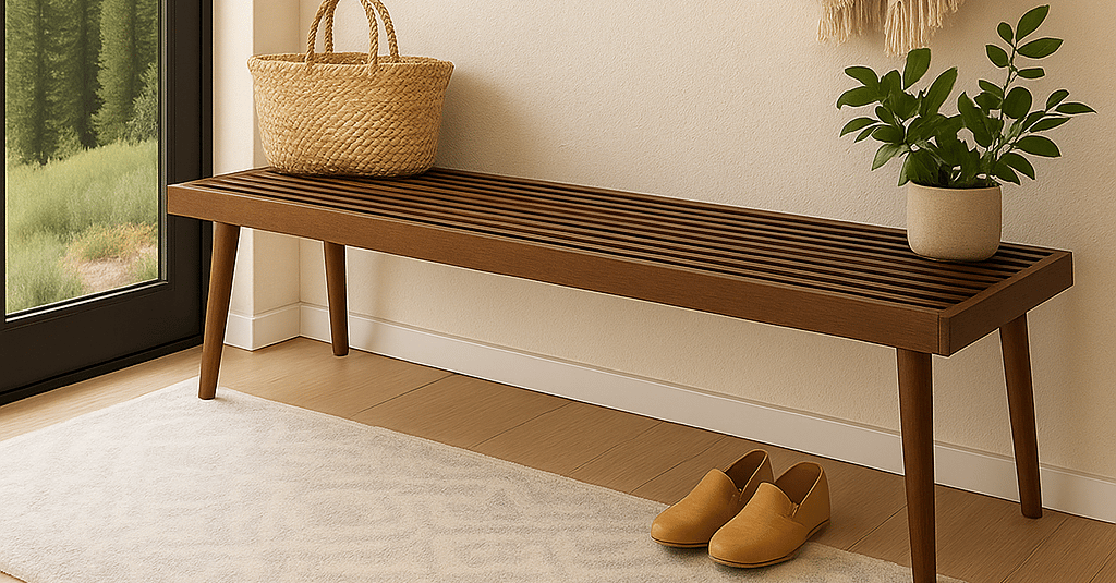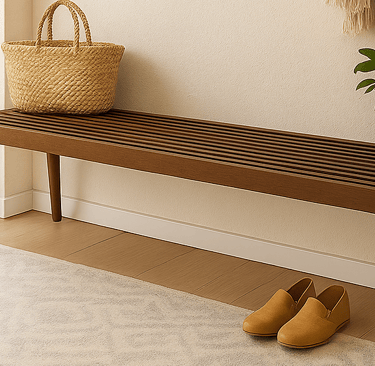 When we started designing our entryway, I had one vision in mind: a warm, minimalist space that felt grounded, modern, and a little rustic—what I call modern mountain style. And at the heart of it, I wanted a statement bench with slatted walnut wood.